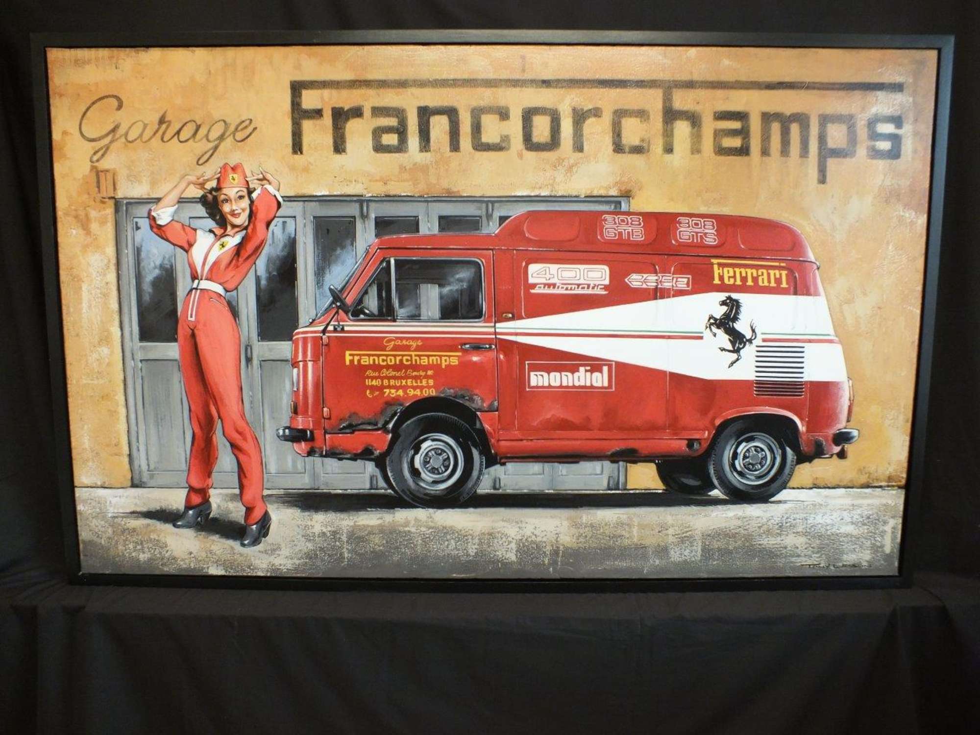 " Ferrari Service ". A framed original Tony Upson acrylic on sheet metal painting. 106cms x 106cms.