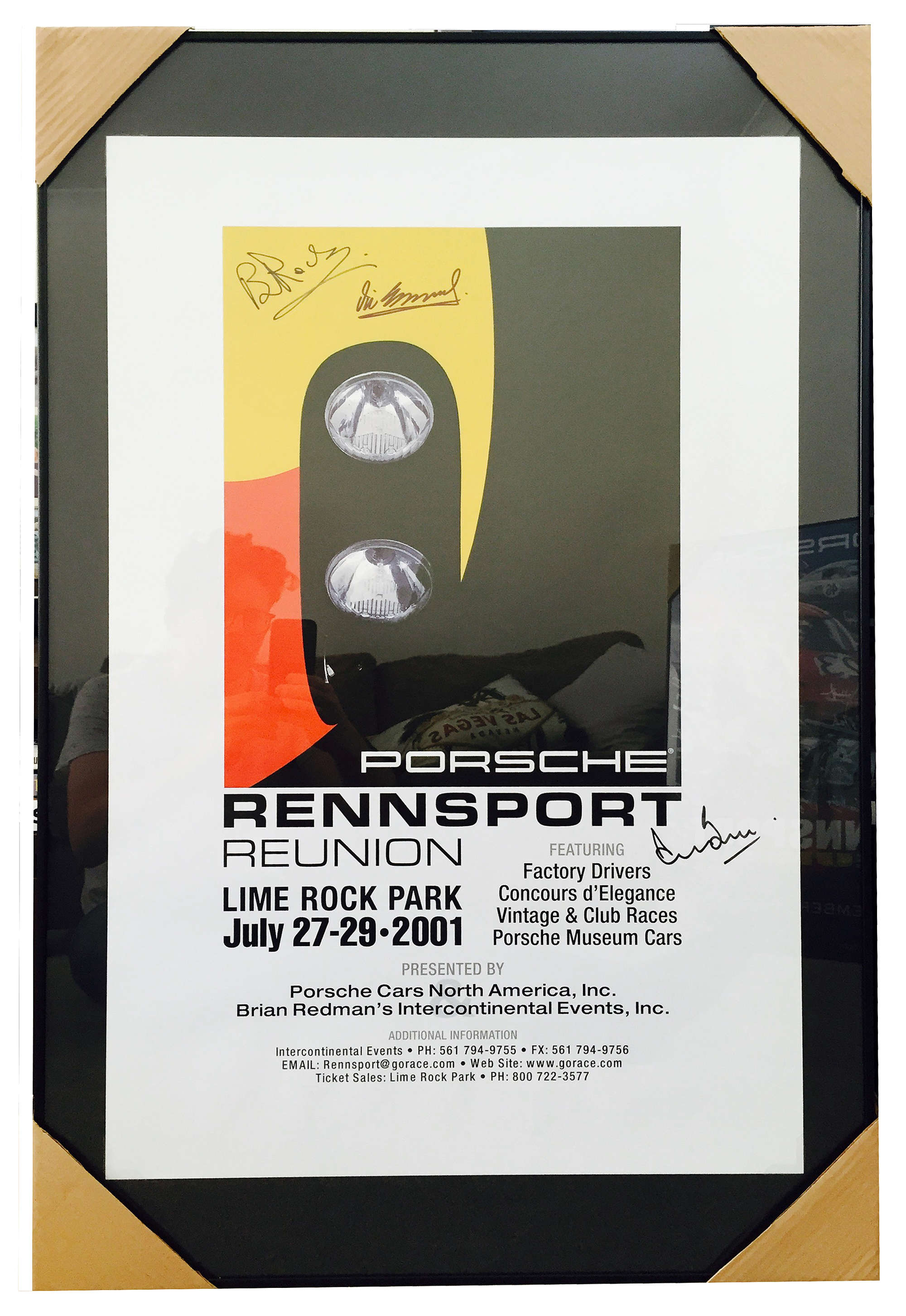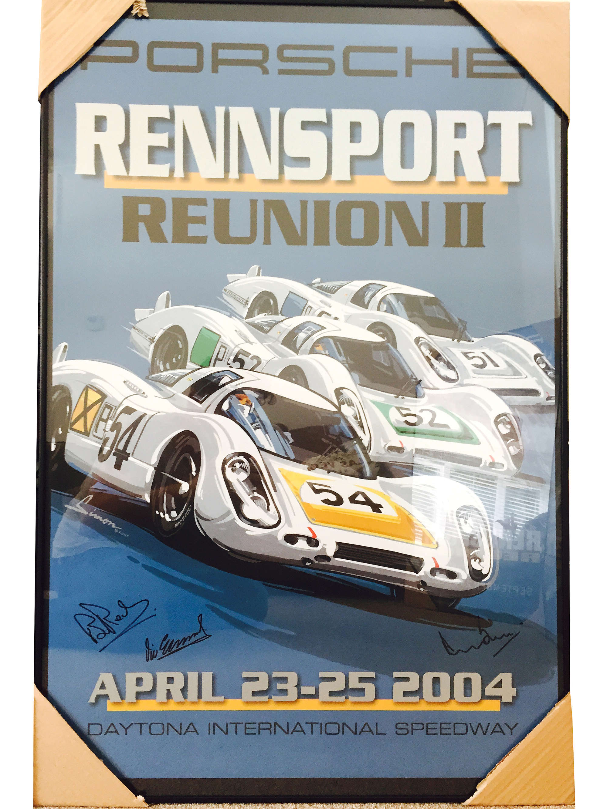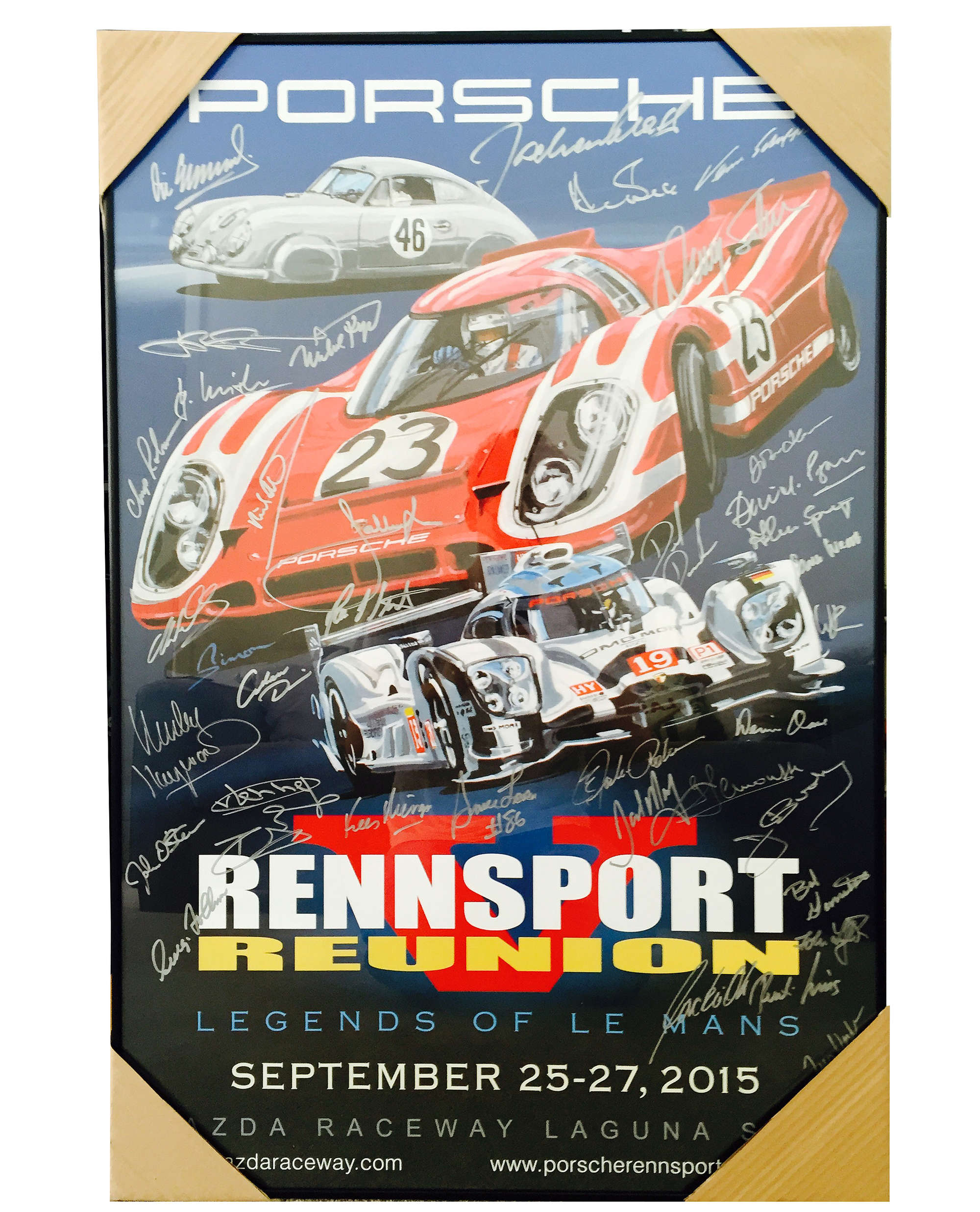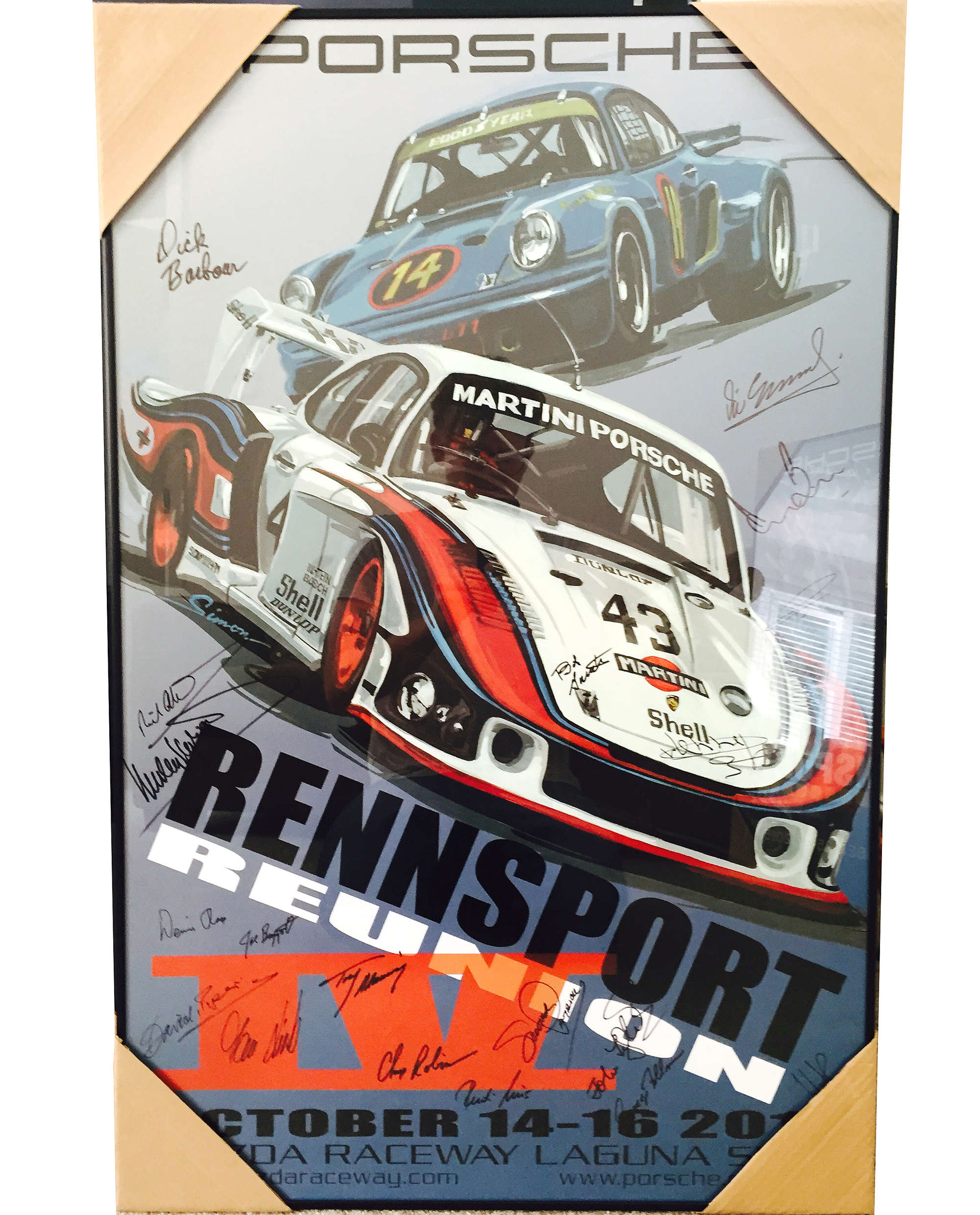 Simply un repeatable set of five original Rennsport Reunion Posters from the USA, 2001 Rennsport Reunion 1 at Limerock Park, 2004 Rennsport Reunion 2 at Daytona International Speedway, Rennsport Reunion 3 in 2007 also at Daytona, Rennsport Reunion 4 at Laguna Seca in 2011 and finally Rennsport Reunion 5 in 2015 at Laguna Seca. All complete with COAs and all containing original hand signatures of some of the worlds best Porsche drivers. The 2015 poster has 38 signatures including David Piper, Jacky Ickx, Richard Attwood and Gerard Larrousse to name a few. All are custom mounted on brushed aluminium frames and look splendid together.