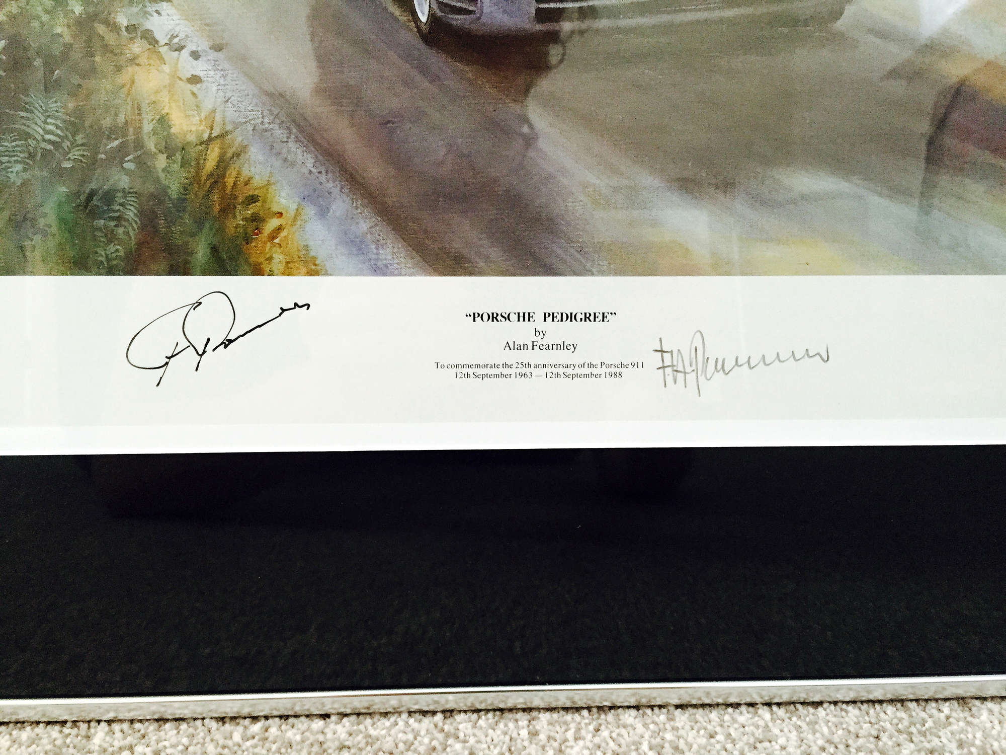 Extremely rare Alan Fearnley lithograph to commemorate 25 years of the Porsche 911 (1963-88), timed with the release of the famous Porsche 959. Hand signed by Professor Dr Ferry Porsche and also Ferdinand Alexander Porsche, no 83 of only 100 signed. Custom mounted on brushed aluminium frame, also complete with COA.