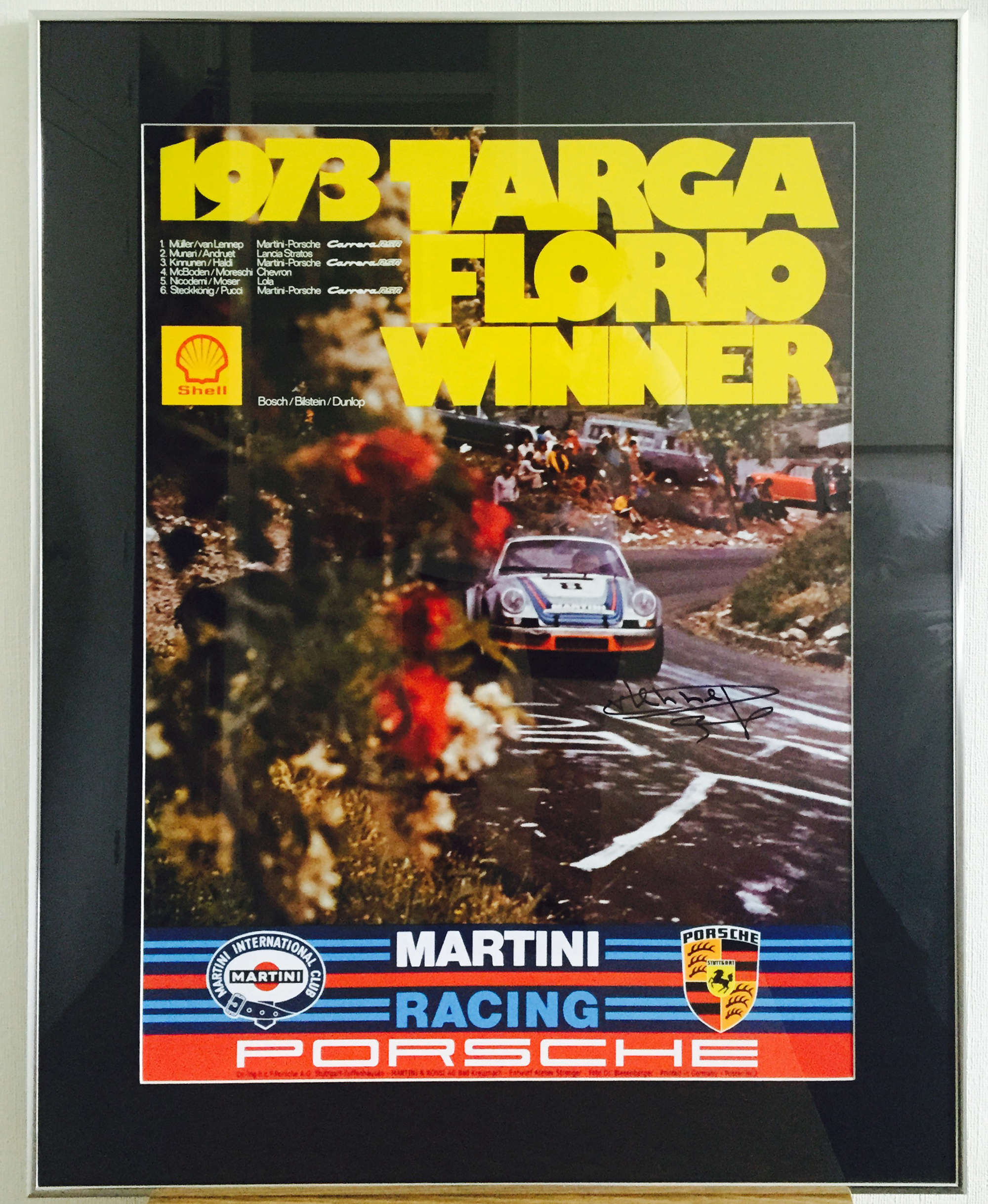"73 Targa" Signed Gijs Van Lennep. High quality poster of the 1973 Targa won by Gijs Van Lennep with Herbert Muller piloting the Martini Porsche Carrera RSR, this poster is also hand signed by Gijs Van Lennep. Complete with signed COA from Vic Elford. Custom mounted on brushed aluminium frame. 56cm x 71.5. 4kg