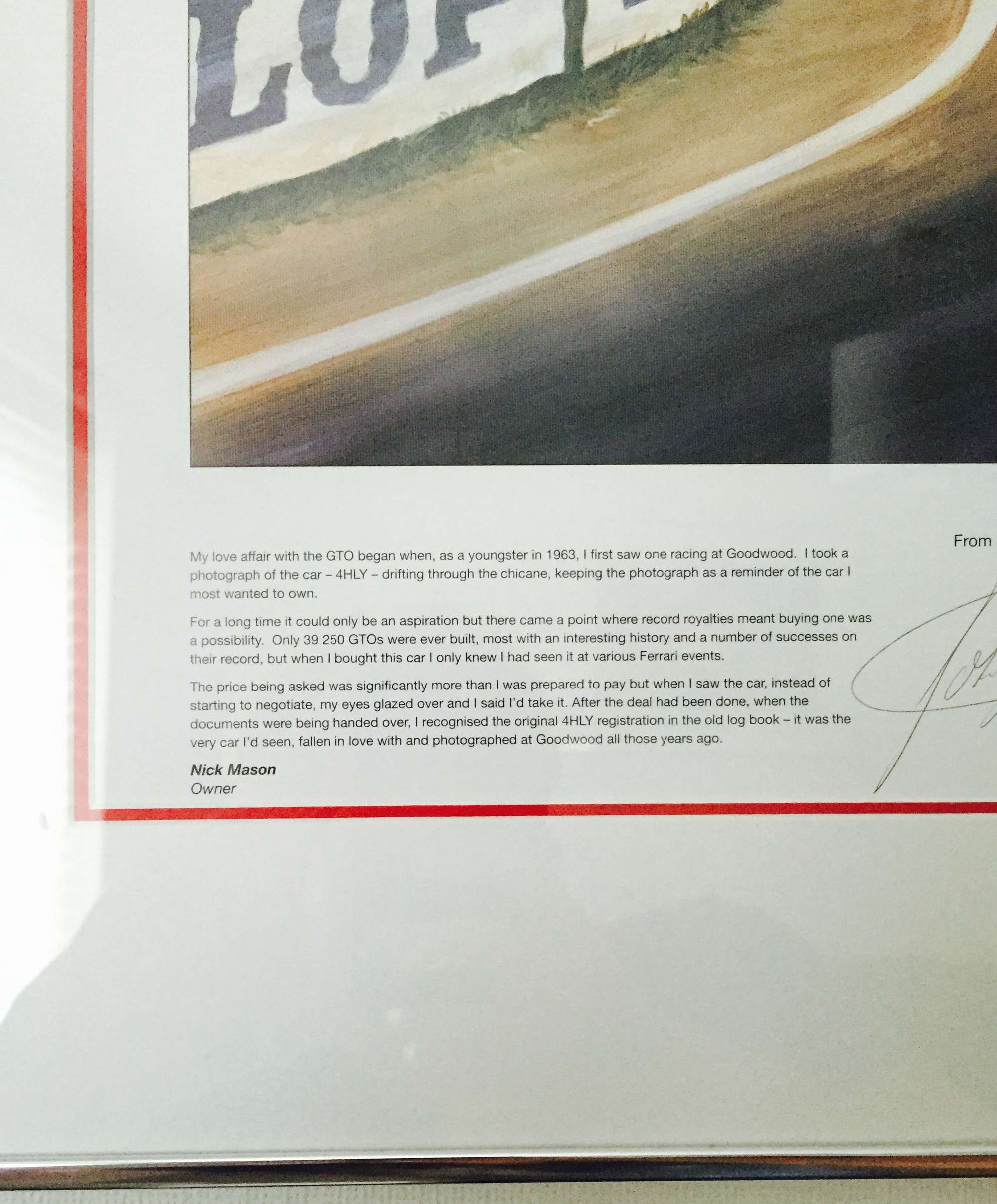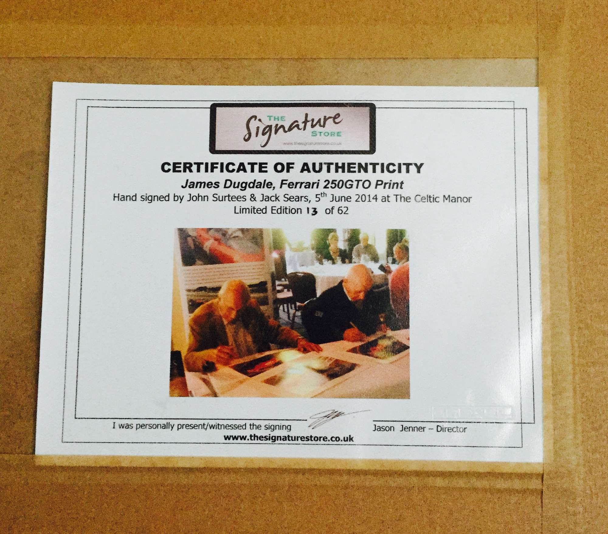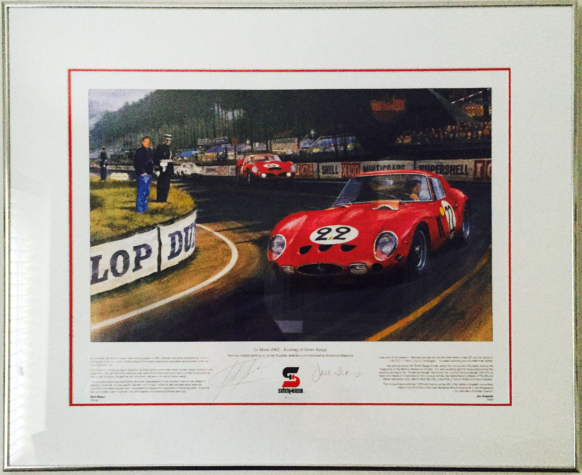 "LeMans 1962 - Evening at Tetre Rouge" - Signed John Surtees, CBE and Jack Sears - From an original painting by James Dugdale, this limited edition fine art print is no 13 of just 62, depicting the Ferrari 250 GTO at LeMans wit words by Nick Mason - the owner of the car and Jim Dugdale the artist. This picture is also hand signed by John Surtees and Jack Sears who both drove 250 GTOs in their careers. Complete with signed COA, and custom double mounted on a brushed aluminium frame. 66cm x 54cm. 3.5kgs