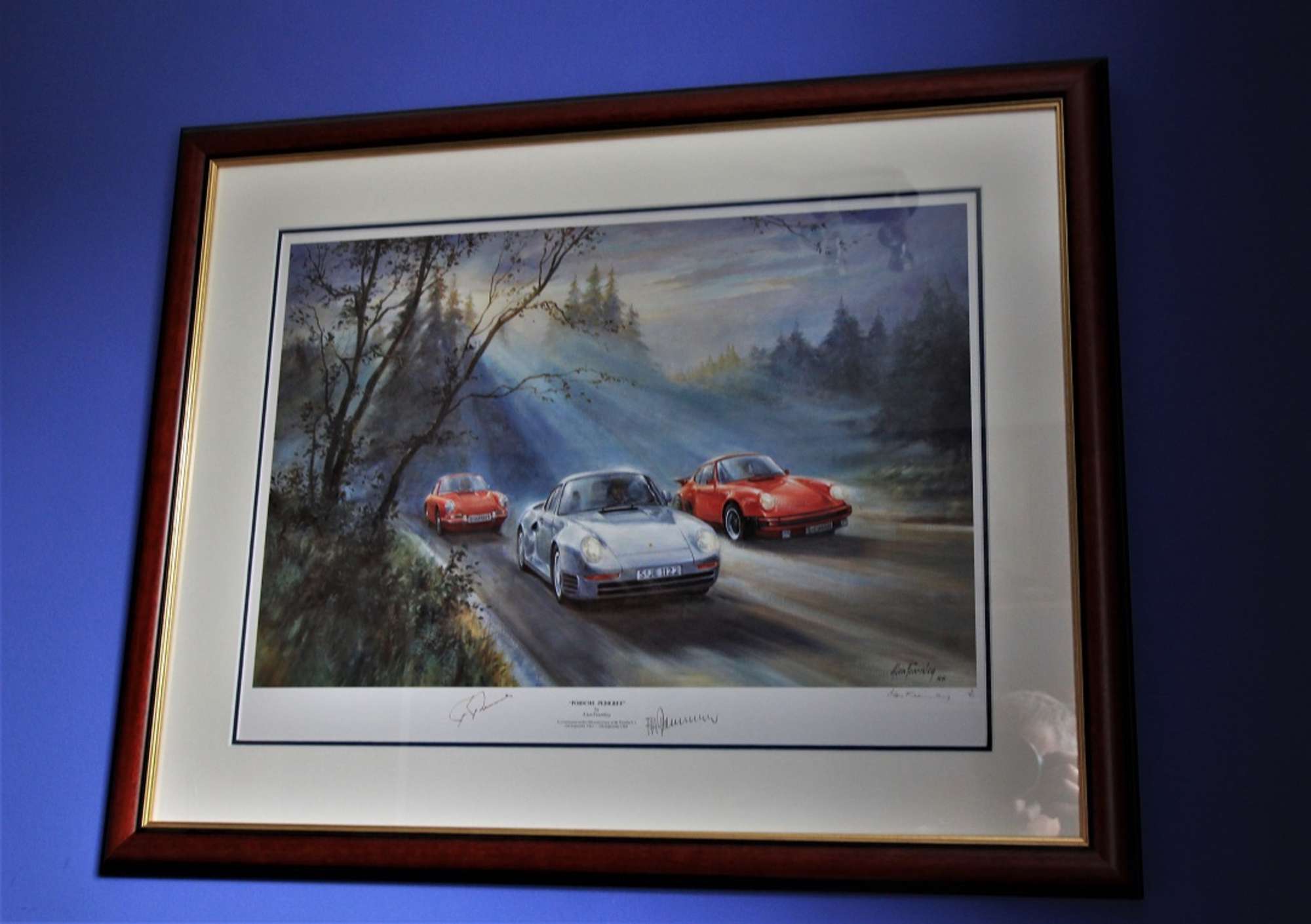 Very rare early number 'Porsche Pedigree' lithograph by Alan Fearnley, hand signed by Dr Ferry Porsche & Ferdinand Alexander Porsche Complete with a Certificate of Authenticity showing the print being signed. The lithograph commemorates 25 years of the Porsche 911 (1963-88), timed to coincide with the release of the famous Porsche 959. Framed in dark wood and glazed. Number 9 of only 100 signed, 75cmx60cm.