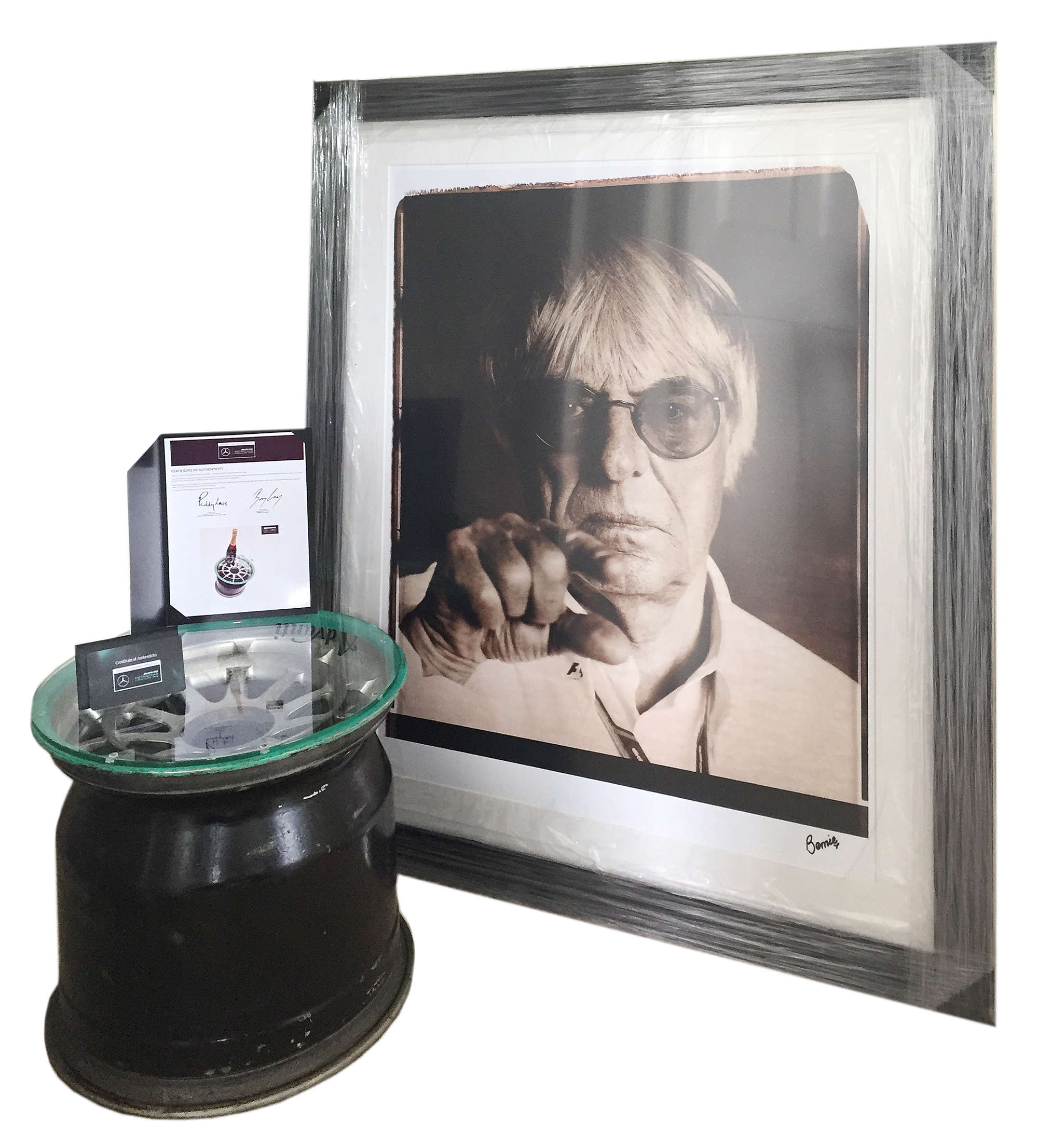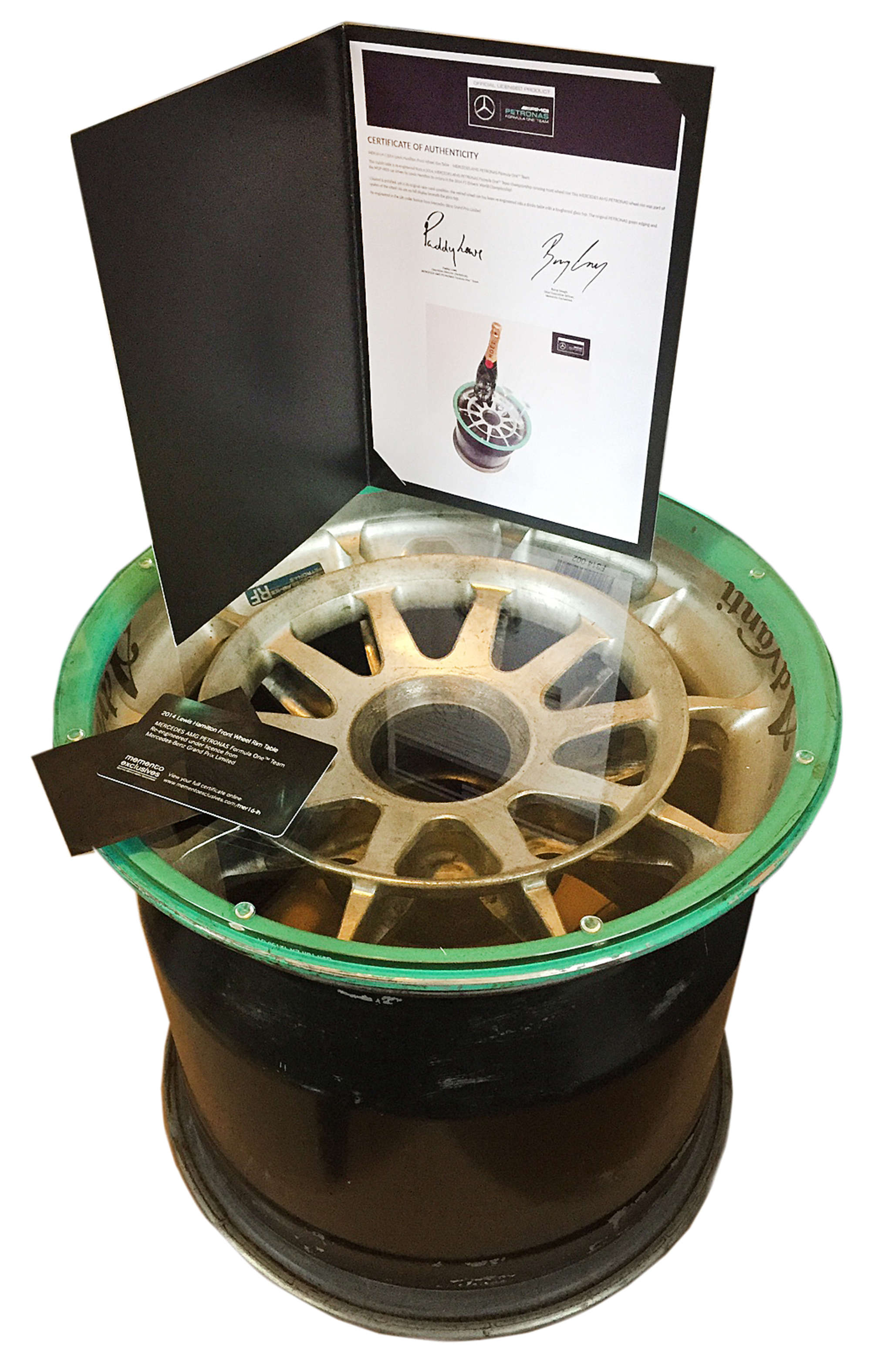 A 2014 *Race Used World Championship No1 Year* Lewis Hamilton front wheel coffee table, complete with COA from Paddy Lowe and gift box. Also included in thsi lot is a signed Bernie Ecclestone Opus Polaroid. It has been custom framed and is extremely rare, limited to 75 he signed with COA 80cm x 98cm.